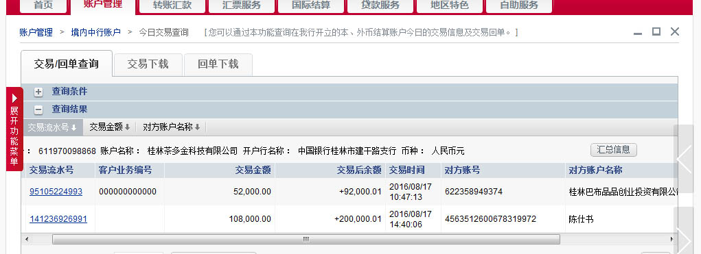 陈仕书及朋友的注册资本金合计108000元于2016年8月17日已经到账,见下图: